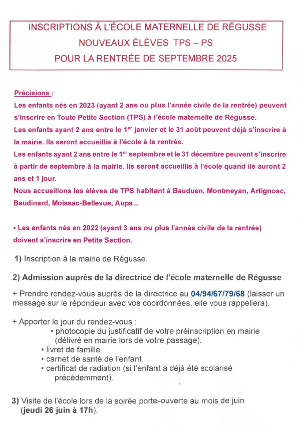 Les inscriptions se font en Mairie, vous devez vous munir de votre livret de famille, du carnet de santé de l'enfant et justificatif de domicile.